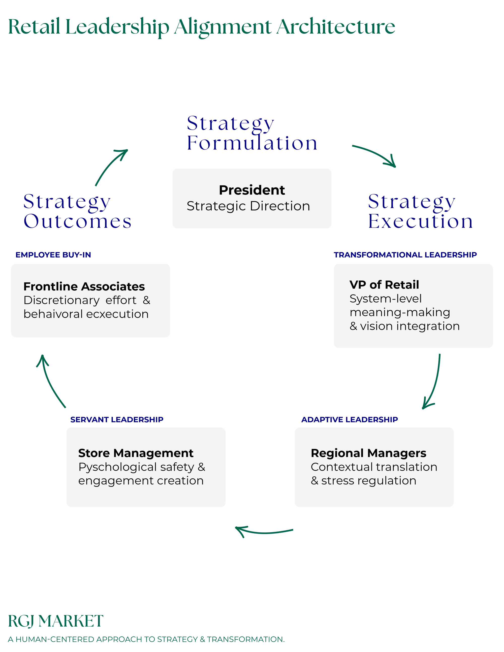 As VP of Retail, USA, the mandate is not only to deliver quarterly results but to architect a leadership system capable of sustaining strategic internalization under constraint. Transformational leadership must operate not as personal charisma but as systemic design. By aligning adaptive and servant leadership across vertical levels, the organization transitions from fragmented compliance to cohesive execution. Closing the strategy–execution gap, therefore, is less a matter of operational refinement and more a matter of leadership architecture. In periods of volatility, competitive advantage resides in the disciplined integration of strategy, culture, and human systems.